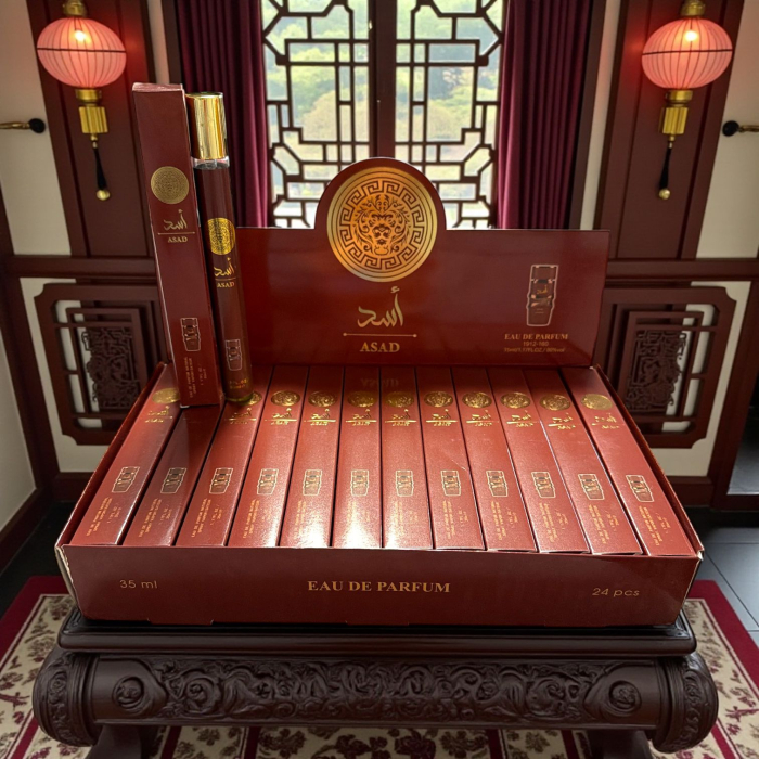 Modelul din imagine este un Eau de Parfum de 35 ml, prezentat si in display de 24 bucati. Denumirea de pe ambalaj este Asad, iar stilul este oriental, cu un caracter cald si puternic. Este potrivit pentru seara, sezon rece sau momentele in care vrei un parfum cu prezenta, dar aplicat controlat.