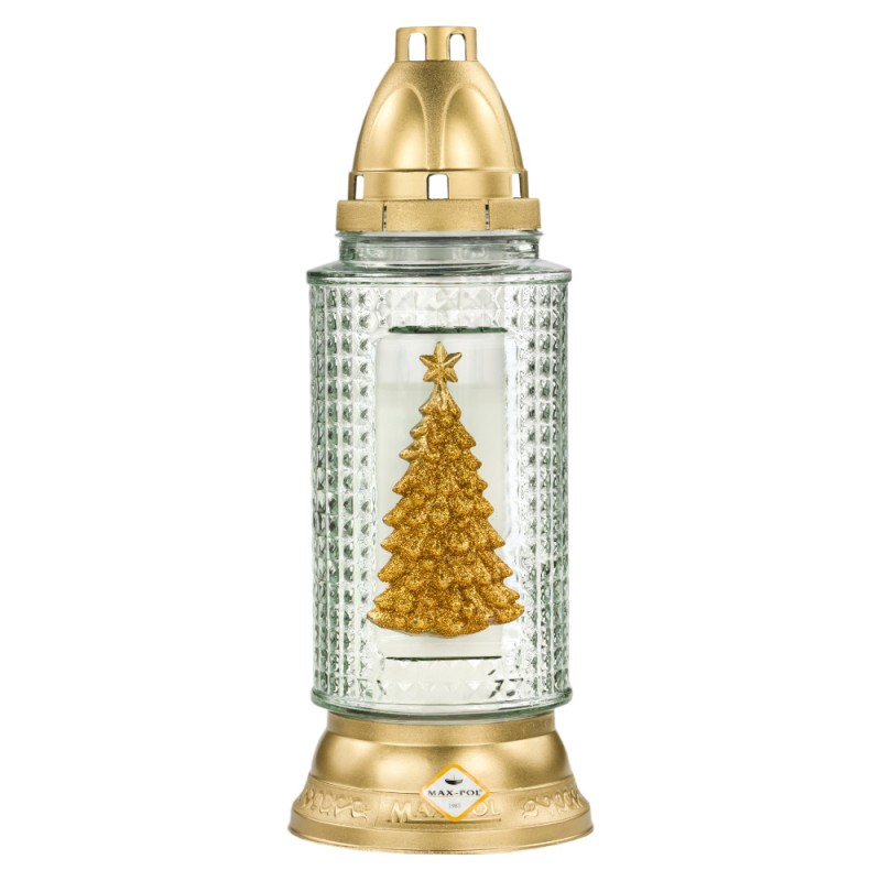 O candela eleganta din sticla, decorata cu un bradut auriu stralucitor. Ofera o lumina calda si placuta, perfecta pentru a completa decorul de sarbatori si pentru a crea o atmosfera festiva si linistitoare.