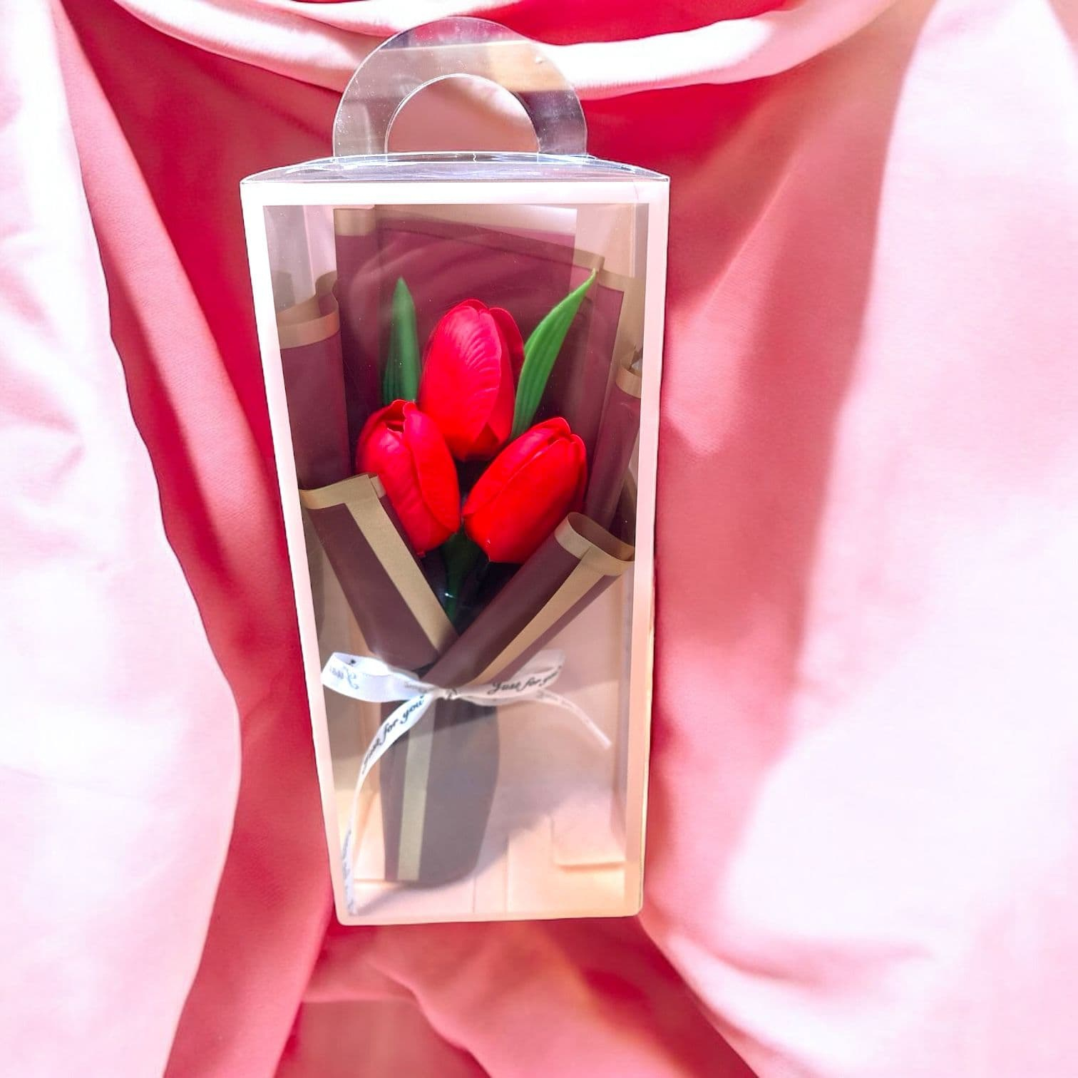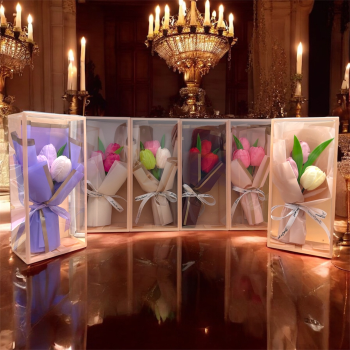 Tip produs: buchet cu 3 lalele din silicon, ambalat in cutie transparenta cu maner