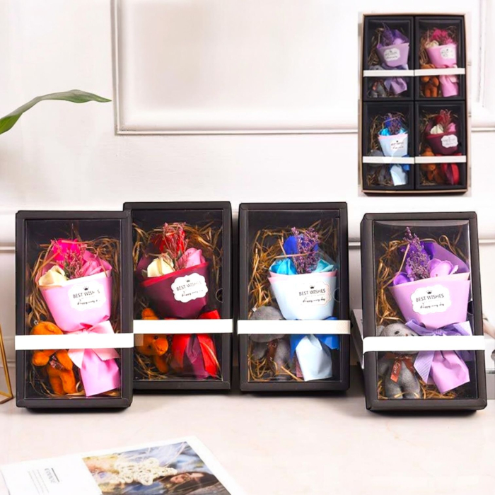 Un cadou elegant si versatil, acest aranjament contine un mini buchet de flori din sapun parfumat, asortat cu un ursulet de plus dragalas, toate ambalate intr-o cutie luxoasa cu capac transparent. Designul este atent realizat pentru a transmite emotie si rafinament, devenind alegerea ideala pentru zile speciale, cadouri simbolice sau expunere in vitrine comerciale.