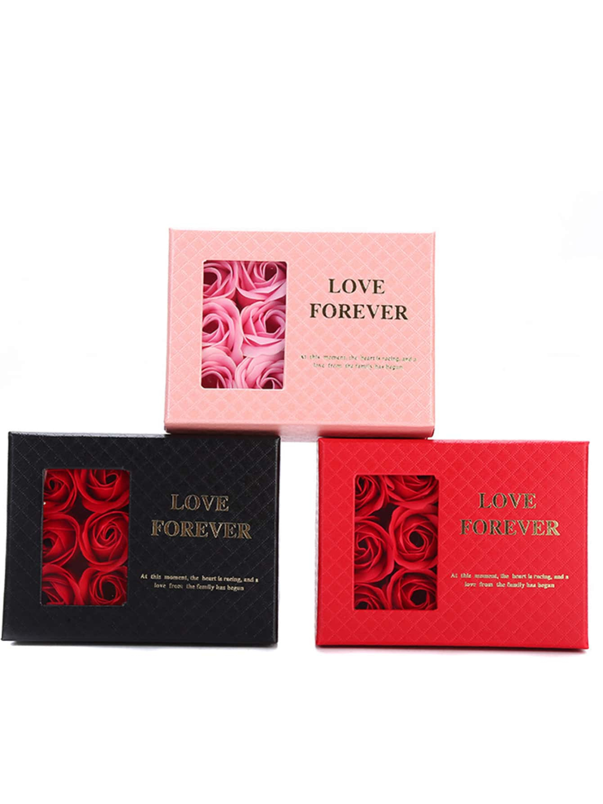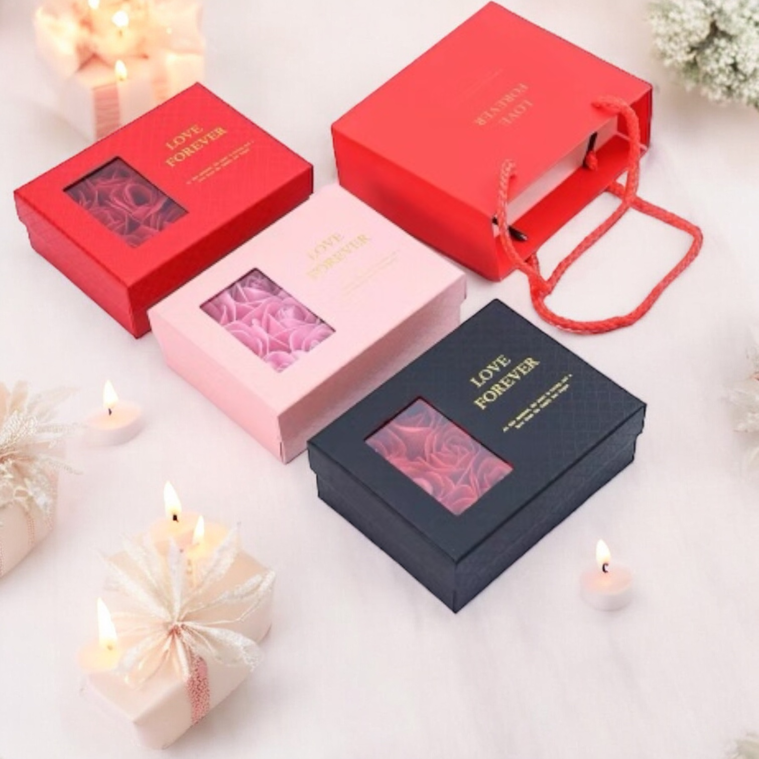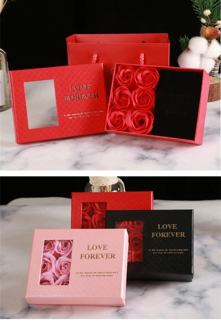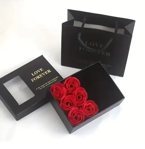 Cutie cadou eleganta, cu fereastra transparenta si 6 trandafiri parfumati din sapun, asezati intr-un compartiment special. Cutia contine si un spatiu dedicat in care se poate aseza simbolic un cadou suplimentar (bijuteriile nu sunt incluse).