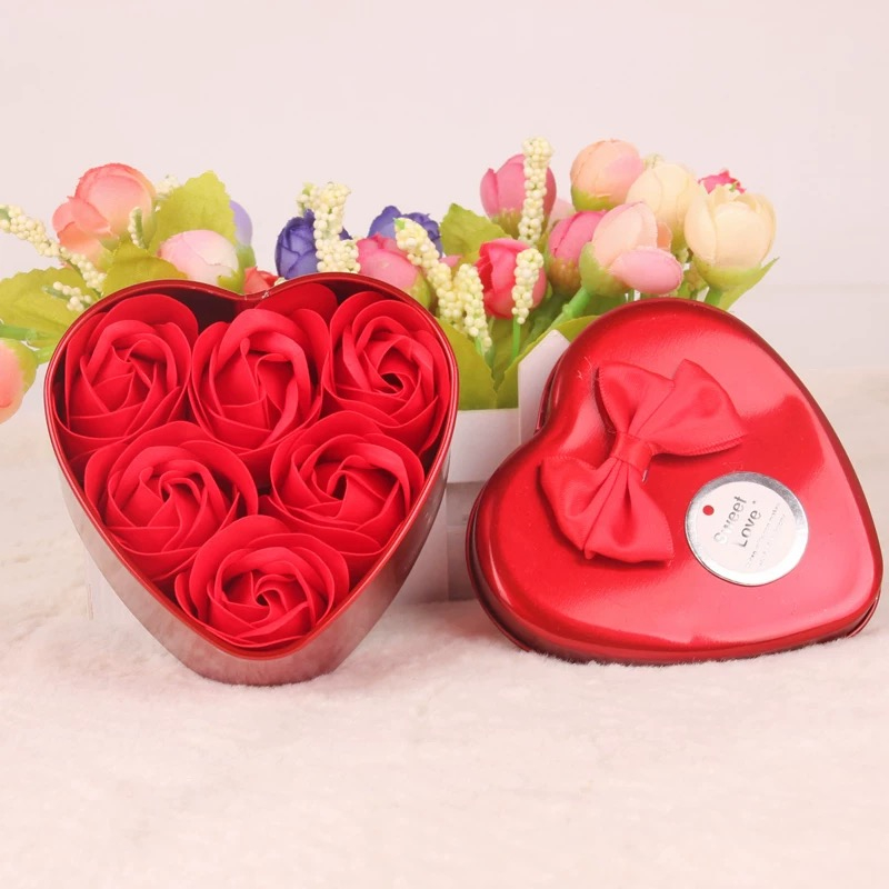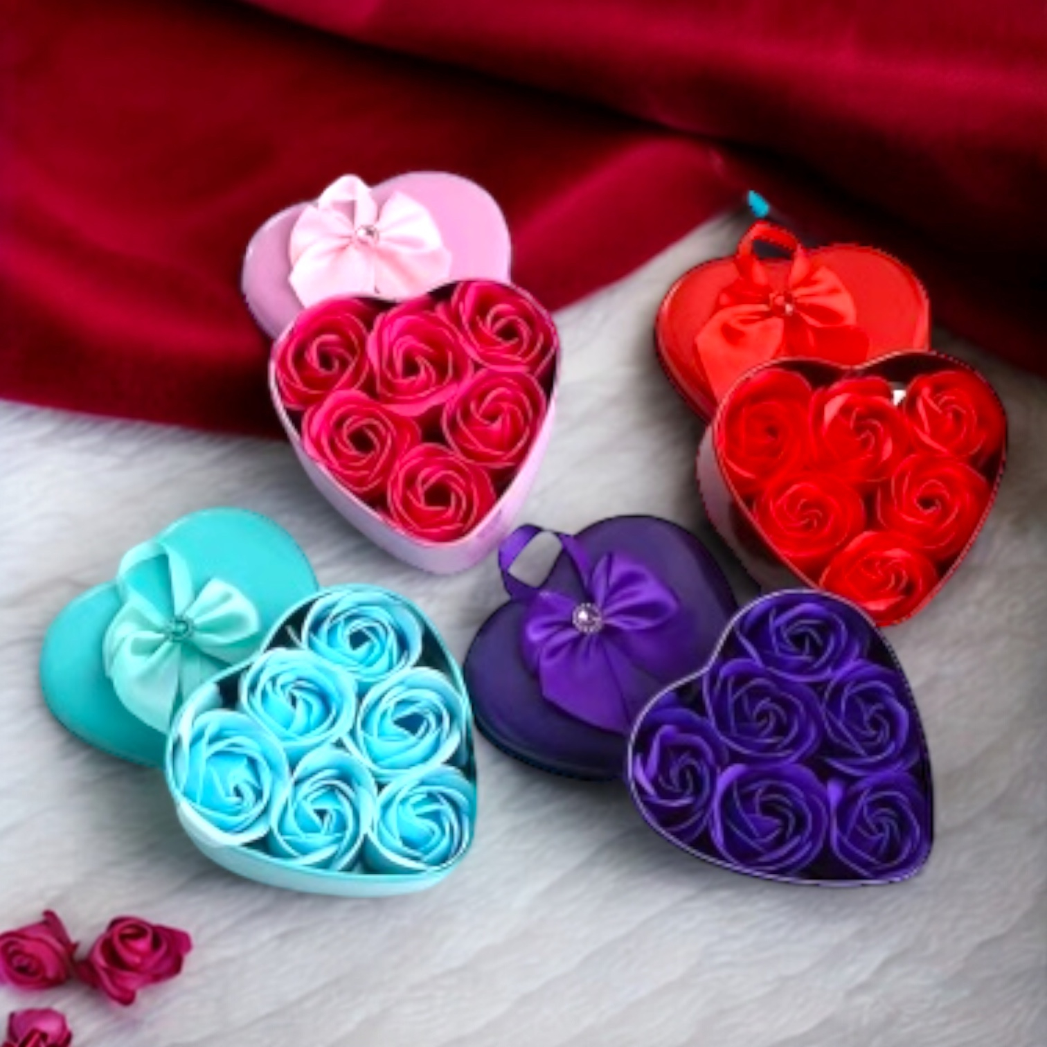 Cutie eleganta din metal, in forma de inimioara, cu capac decorat cu fundita satinata si stras decorativ. Contine 6 trandafiri din sapun parfumat, atent asezati, gata de oferit ca gest simbolic de iubire si apreciere.