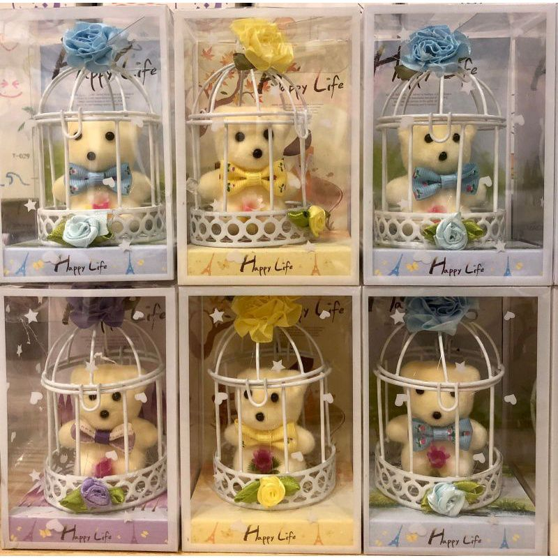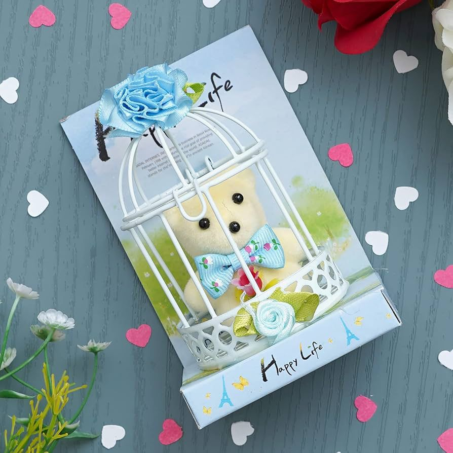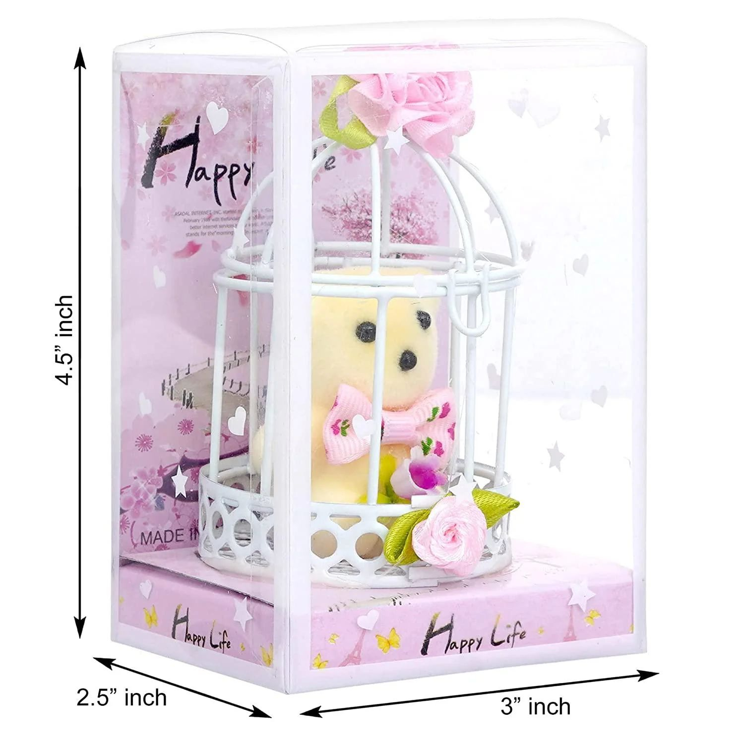 Aranjamentul are dimensiunea de 7.6×6.5×11.3cm. Este compact si usor de integrat in orice spatiu. Colivia decorativa ofera un aspect elegant. Florile artificiale sunt luminoase si placute vizual. Ursuletul este atent pozitionat pentru un efect final armonios. Cutia transparenta protejeaza aranjamentul si il face gata de oferit.