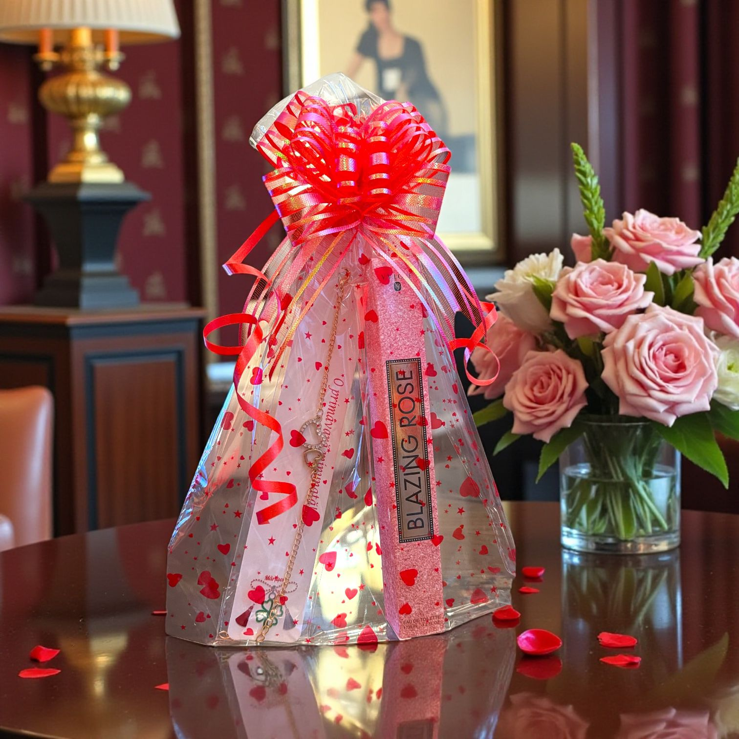 Acest aranjament cadou martisor este pregatit complet pentru a fi daruit, intr-un ambalaj transparent cu inimioare si fundita rosie voluminoasa. Se vede frumos, arata elegant pe masa sau in vitrina si creeaza instant impresia de cadou premium, fara sa mai fie nevoie de impachetare suplimentara.