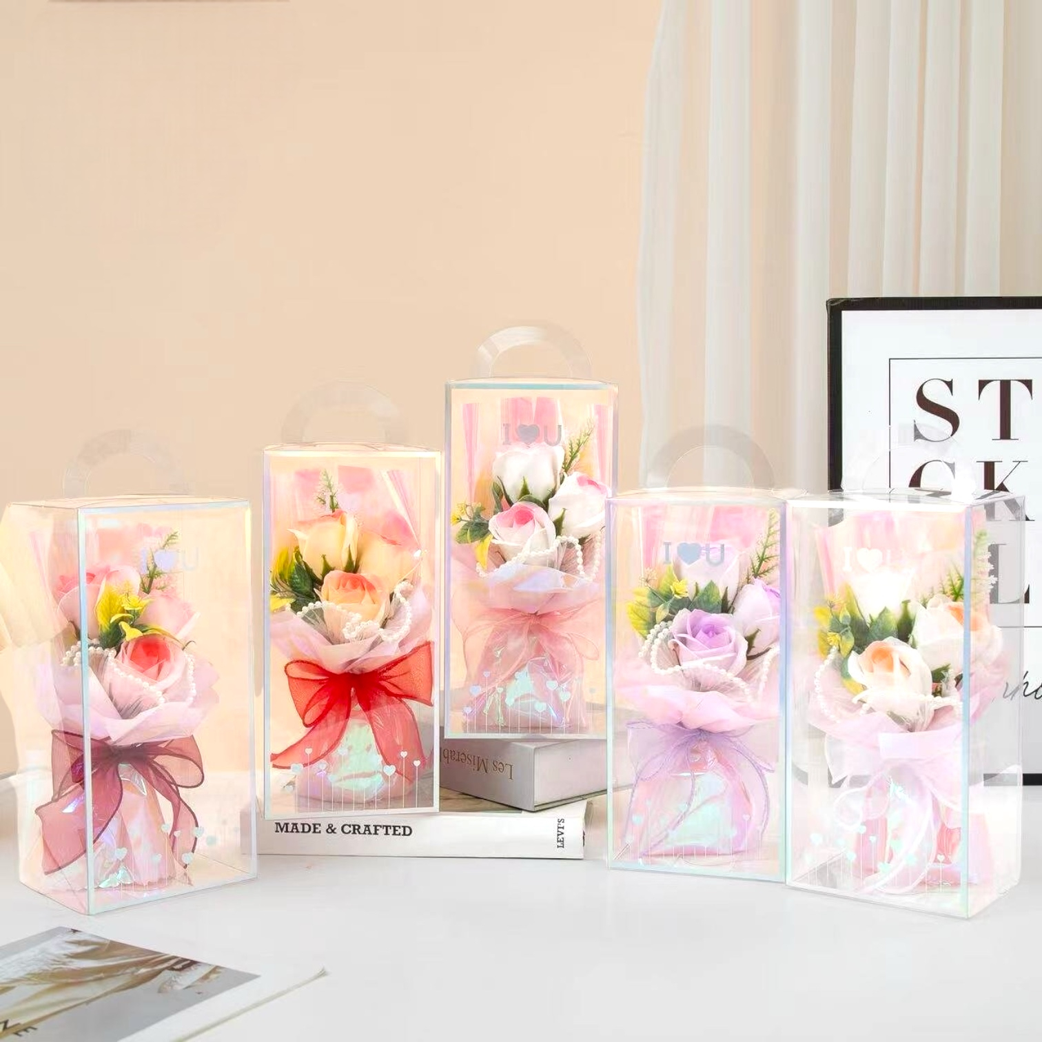 Prezentare Vizuala Spectaculoasa: Efectul irizat al cutiei transparenta face ca acest cadou sa iasa in evidenta, creand un aspect luxos si modern.