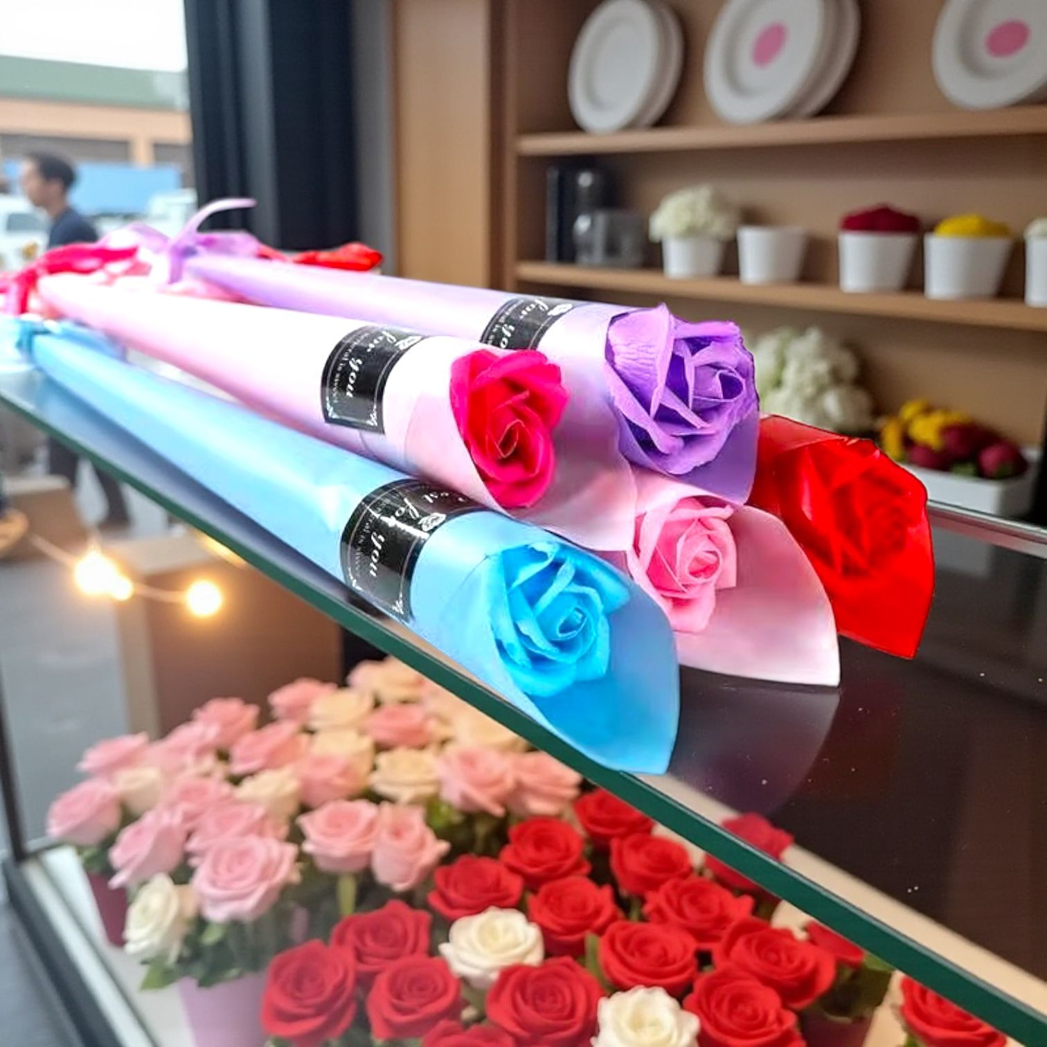 Realizat din sapun de calitate, cu textura realista si culori vibrante – rosu, roz, mov, fucsia si albastru – trandafirul isi pastreaza aspectul impecabil in timp, fara a necesita intretinere. Este o alegere inspirata pentru magazine de cadouri, florarii sau evenimente tematice.